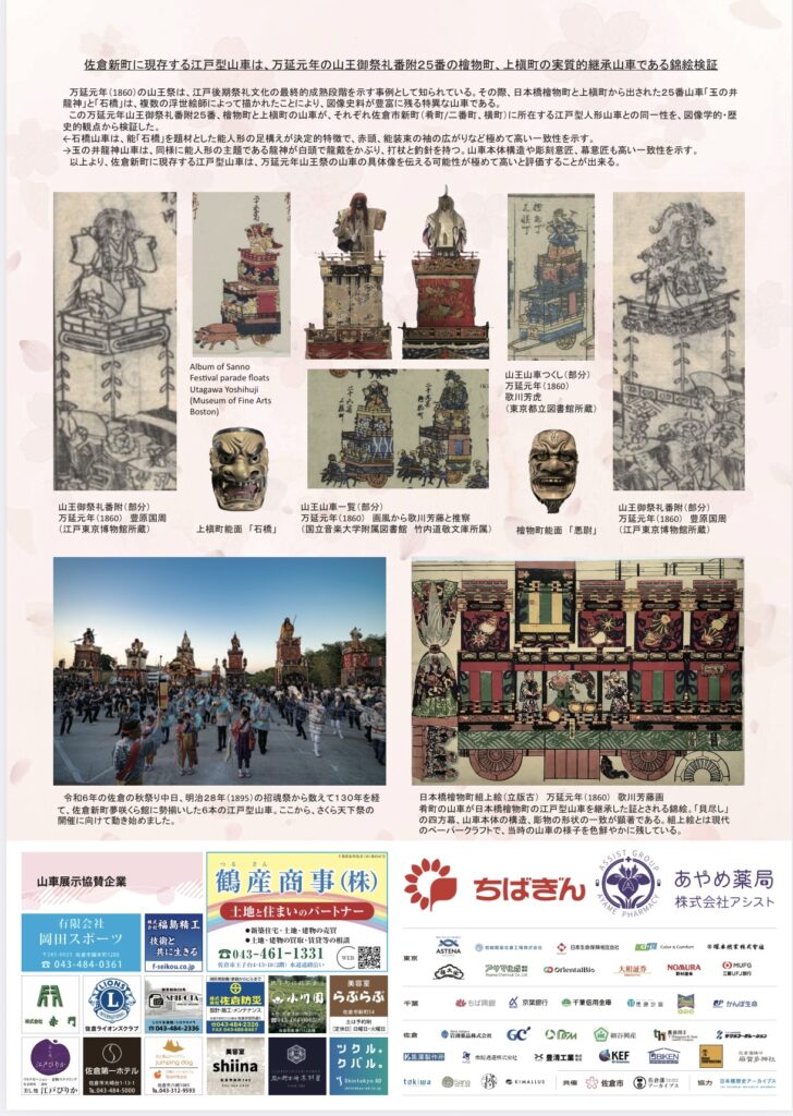 - 特別展示:山王御祭礼番附、山王山車一覧、山王御祭礼練込図など万延元年製作の錦絵。堀田家幟旗など。