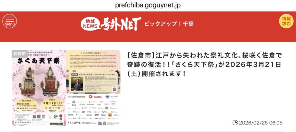 地域ニュース号外ネット千葉 2026年3月5日 最終更新日時 : 2026年3月19日 sakuratenkamatsuri 昨年の雨天中止からの日本橋檜物町「玉の井龍神能人形山車」展示から、今年さらにパワーアップした さくら天下祭 について、詳細に記事を書いていただきました。 いいね:いいね 読み込み中…