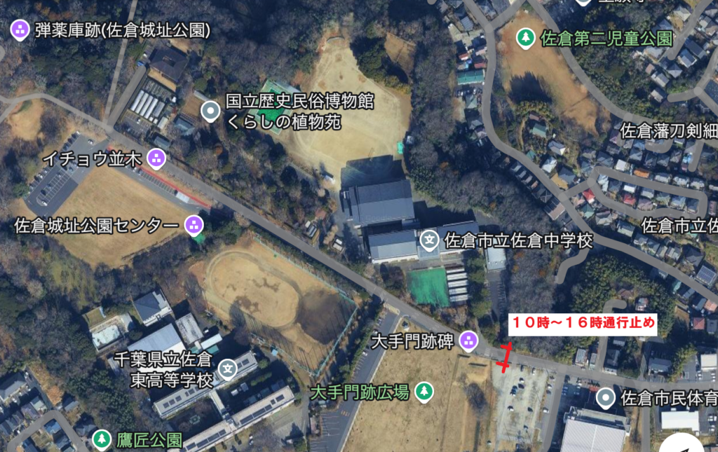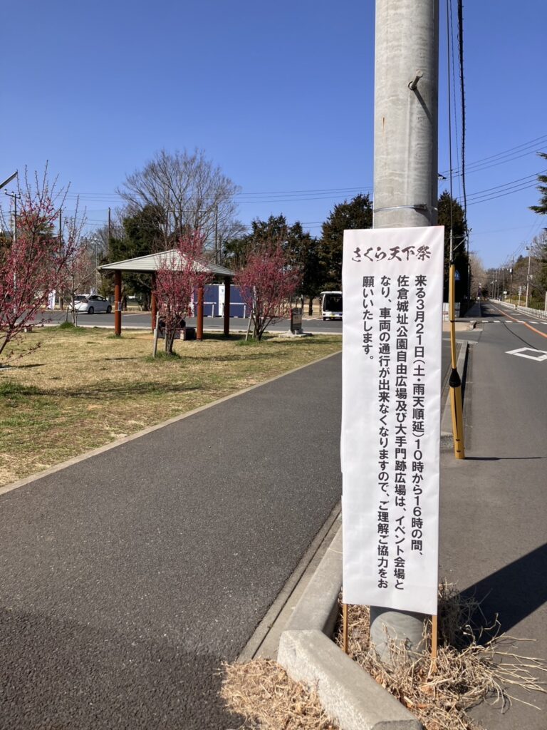 通行止め看板設置 2026年3月14日 最終更新日時 : 2026年3月19日 sakuratenkamatsuri さくら天下祭の開催に伴いまして、佐倉城址公園大手門広場前(佐倉中学校入口)から先は車両通行止めとなります。ご迷惑をお掛けいたしますが、何卒よろしくお願い申し上げます。 いいね:いいね 読み込み中…